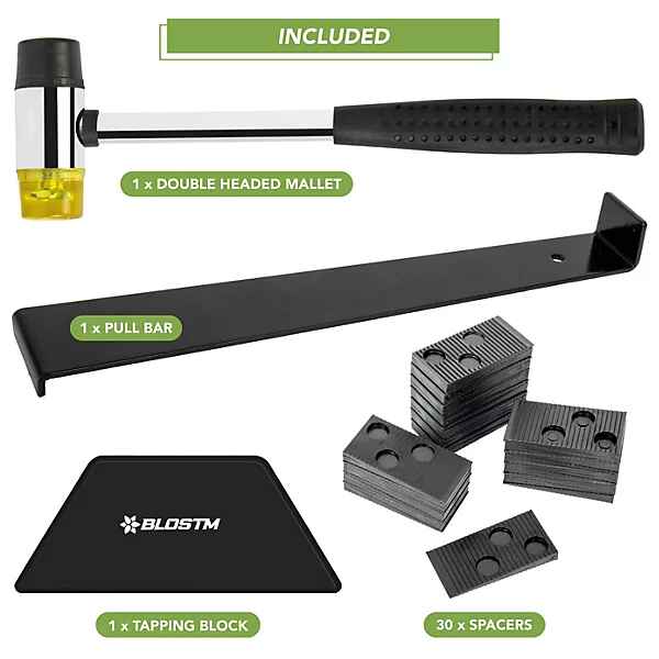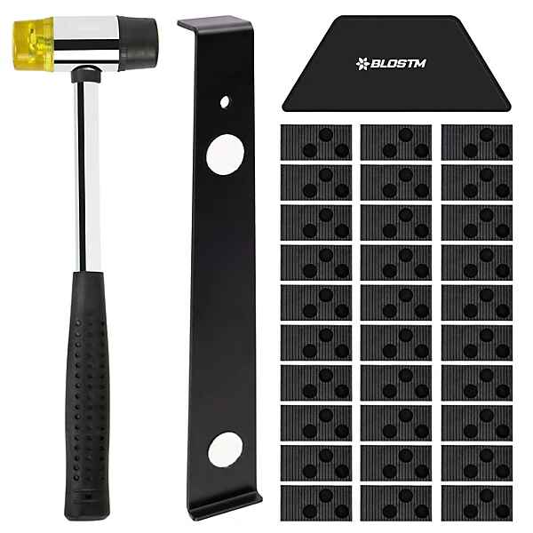 BLOSTM Laminate Flooring Kit – 30 Hardwood Floor Spacers, Double-Faced Rubber Mallet with Comfort Grip, Robust Tapping Block & Heavy Duty Pull Bar for Laminate Flooring – All in One Wood Laminate Flooring Tools Set If you’re installing new laminate or hardwood floors, it’s essential to have the proper laminate floor fitting kit for a professional finish. This flooring installation kit is a necessity for both laminate and hardwood floors from 7-15 mm. Each kit includes a rubber tapping block, pull bar, 30 laminate flooring spacers, and a double-headed mallet.