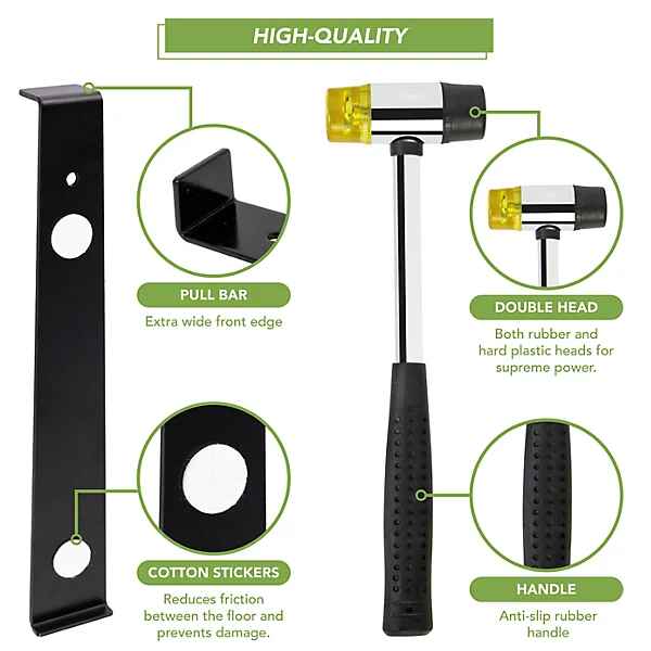 - COMPLETE FLOORING INSTALLATION KIT – If you’re preparing to install new hardwood or laminate flooring, this great value kit includes a rubber tapping block, pull bar, 30 flooring spacers, and a double-faced rubber mallet.