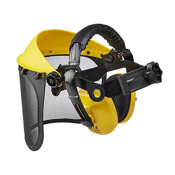 Stay safe with this face shield and guard, suitable for glasses wearers, and with ear defenders to block out the potentially dangerous loud noise.